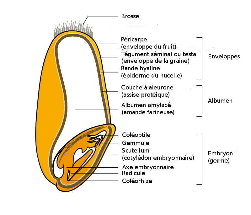 Le grain de blé est composé de trois parties fondamentales : l’enveloppe, l’amande farineuse et le germe.