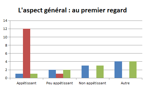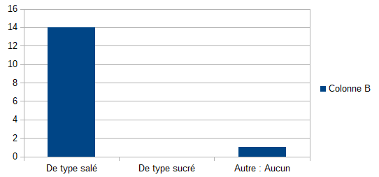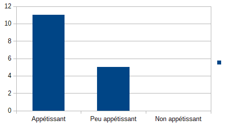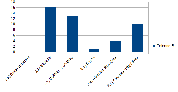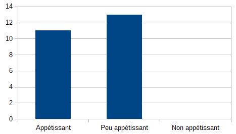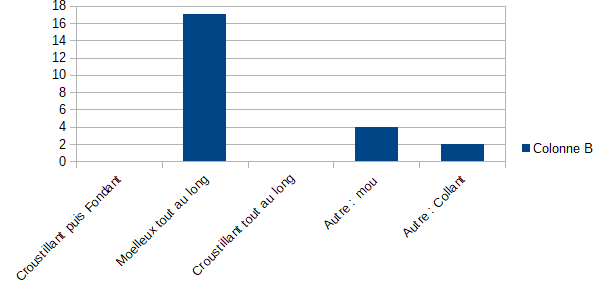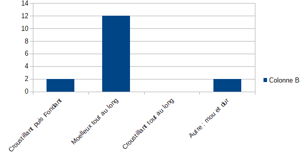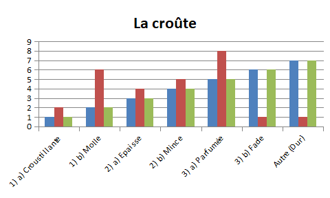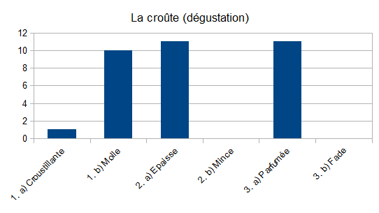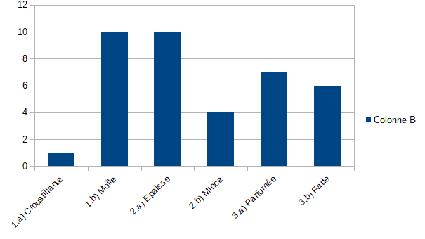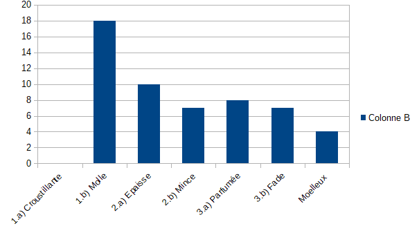 Suite au sondage, nous avons réalisé des graphiques correspondant aux réponses des testeurs pour chacune des catégories d’évaluation des pains, que nous avons également déterminées nous-mêmes. Aussi, les graphiques sont accompagnés de commentaires analytiques