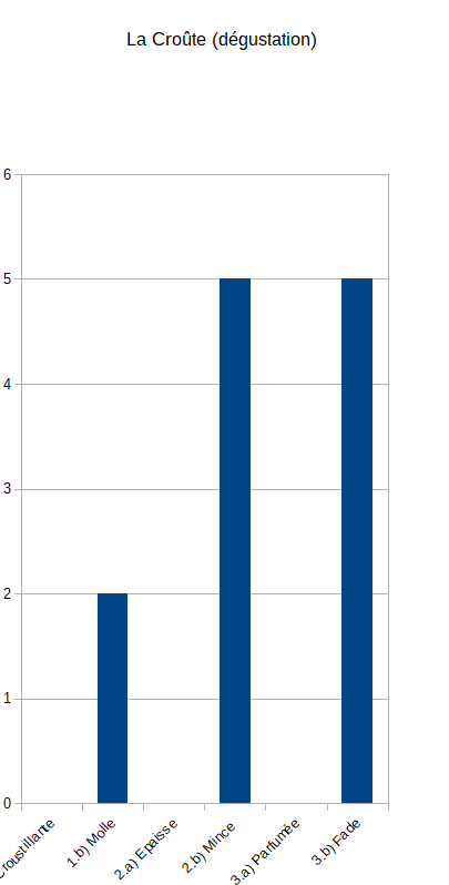 D’après les résultats apportés, nous pouvons constater que très peu de testeurs ont dit que la pâte était croustillante (sûrement dû à la congélation la veille), beaucoup la trouve molle, mais 1/3 considère que la croûte est croustillante pour le T150 (0 pour le T 45). Ensuite, concernant l’épaisseur de la croûte, la majorité des T sont considérés comme épais contrairement au T55 qui a été constaté mince par la plupart des testeurs (5/5).
