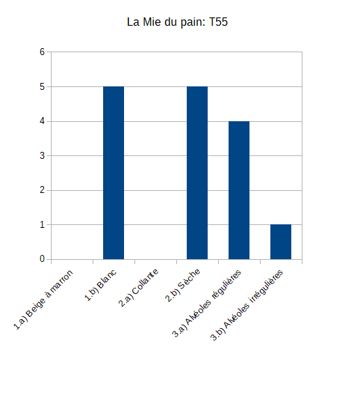 Nous en avons déduit que les T45 et T55 possèdent une mie blanche à l’inverse des T80,110 et 150 qui possèdent une mie beige/marron. De plus, le T65 est une transition entre les pains blancs et les pains beiges/marrons. Concernant la texture de la mie, il n’existe pas de groupes distincts : seul le T55 présente une mie sèche, plus que collante d’après les personnes interrogées.