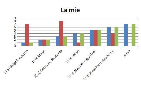 Lorsque nous avons demandé leur avis au sujet de la consistance de la mie (alvéoles de la pâte), les testeurs n’ont pas tant discerné deux groupes particuliers (sûrement dû à l’utilisation d’une machine à pain qui « empêche » l’exposition à l’humidité, et, comme expliqué dans l’article ci-contre « Quelques notions essentielles », chaque type de farine de blé a besoin de sa propre hydratation : ce qui n’a pas été respecté dans la recette par volonté de proportions similaires (dont l’eau)).