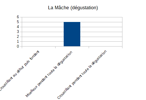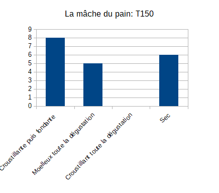 À la suite de la comparaison des graphiques les uns avec les autres, nous pouvons considérer que, pour un grand nombre de pains, la mâche ait été estimée « moelleuse tout au long de la dégustation ». Ceci peut être expliqué du fait de la congélation de tous les pains la veille. Mis-à-part pour les T80, T110 et T150, vus comme « croustillante puis fondante ». Par exemple, le T150 a récolté 4,5 voix pour la catégorie « moelleuse tout au long de la dégustation » mais aussi 8 voix pour le critère « croustillante puis fondante ». De plus, ce pain-ci a également été jugé « sec » par 6 personnes, au même titre qu’un testeur pour le T110.